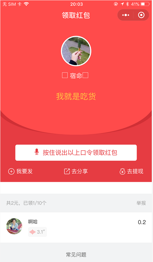 经过技术团队加班努力,咱们的语音口令红包功能正式上线啦,只要说出发起人设置的口令,程序会智能识别你的语音,识别成功后就可以领取到赏金啦,欢迎合作伙伴体验测试。接下来,语音口令红包将和我们现有的同城生活、内容资讯、商城、票务、微页面等应用深度打通,在很多场景都可以发起语音红包。