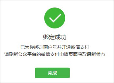 3、验证成功后,将会进入绑定成功页;你可通过该商户号进行微信支付的开发,通过该商户号进行收款。看到绑定成功提示后,你的微信支付功能已成功开通,请刷新公众平台的微信支付申请页获取*新状态。如下图所示: